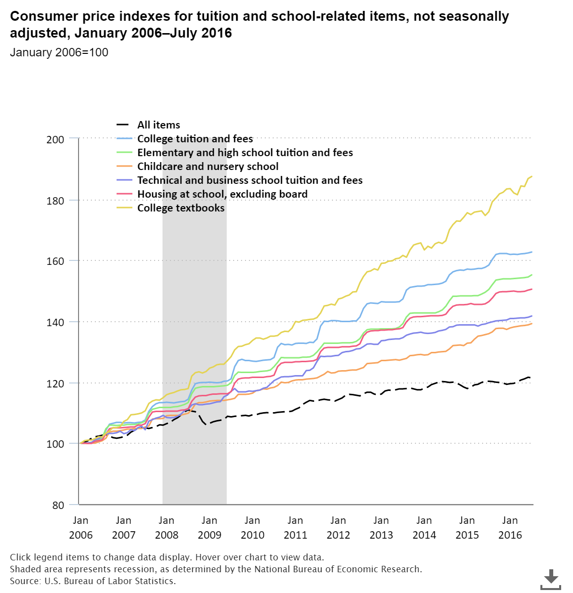 The US Bureau of Labor Statistics found that between 2006 and 2016, the price of a textbook increased by 88%. The increase is even greater than the rise in housing costs and university fees, which are 63% and 50% higher.